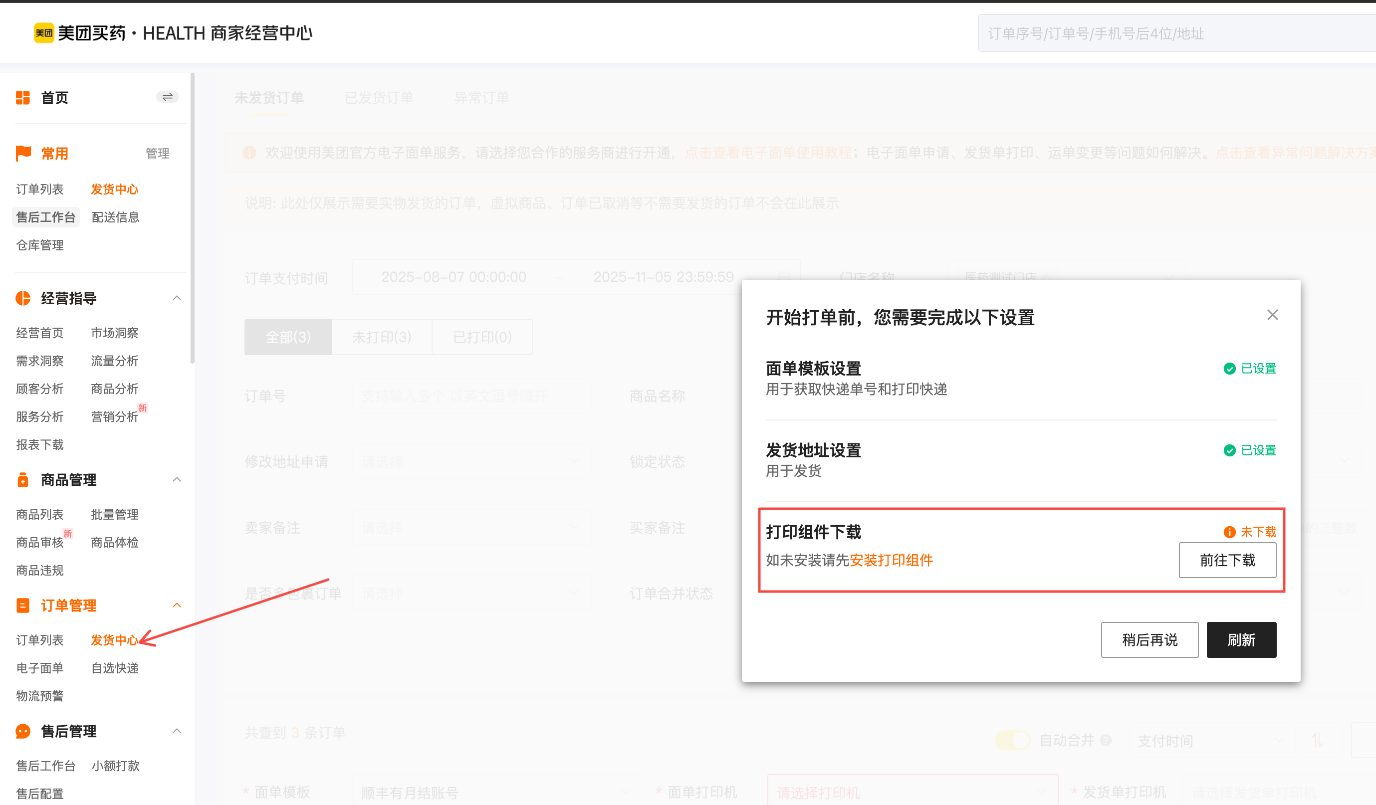 现象:打印组件下载安装并启动,打印测试页正常,但是“商家中心-发货中心”页面还是提示未安装打印组件