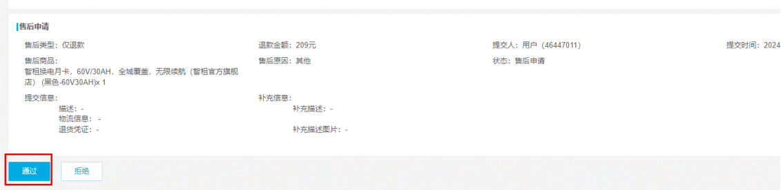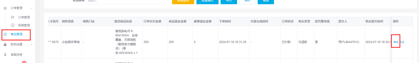 ②用户发起取消:售后管理-查询到对应订单-操作栏-审核-通过,即完成退款,注意用户发起退款,如商家48小时内未处理,系统默认同意退款,款项自动退回给用户