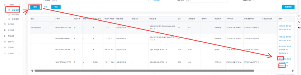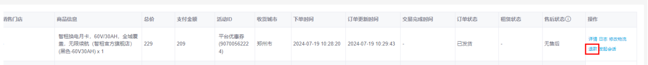 操作路径:订单管理-查询到对应订单-操作栏-发货