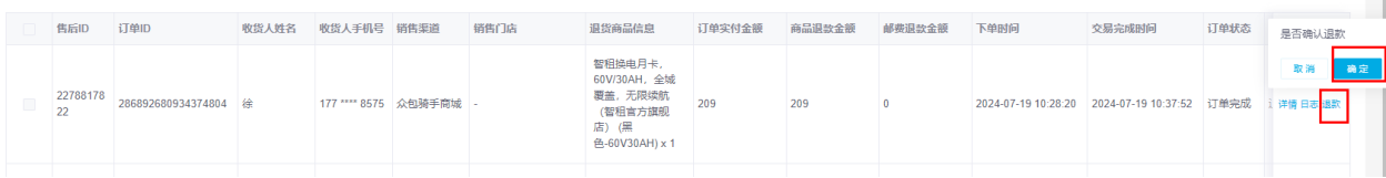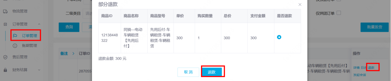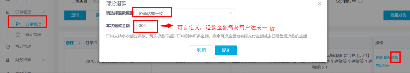②商家发起退款:订单管理-查询到对应订单-操作栏-退款,支持部分退款,退款金额需与用户协商一致(可发起多次部分退款,但每次退款金额不得超过剩余可退金额)