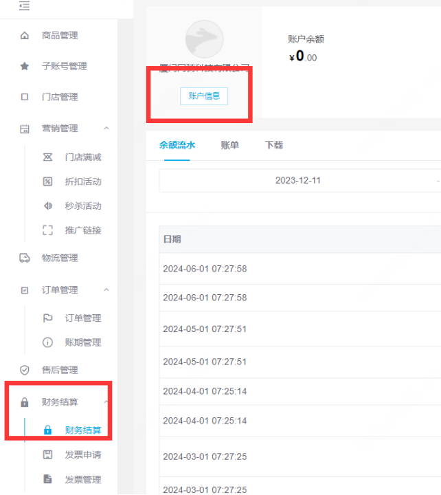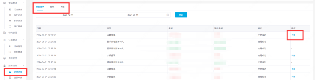 操作路径:财务结算-余额流水(查询时间跨度不可超过1年)