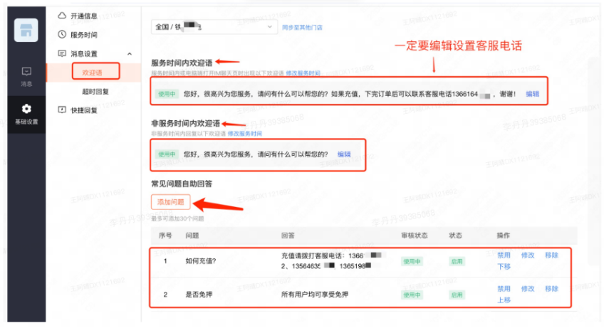 ④设置欢迎语(需要写清楚骑手需充值或者遇到问题可联系电话xxx)