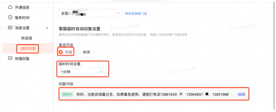 ⑤超时回复设置经常涉及问题:你好,当前咨询量过多,如果遇到问题着急使用,请拨打电话XXXXX