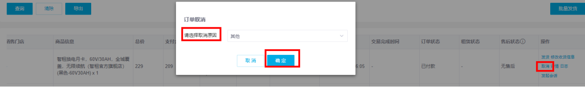 ①商家发起取消:订单管理-查询到对应订单-操作栏-取消,此操作需与用户协商一致