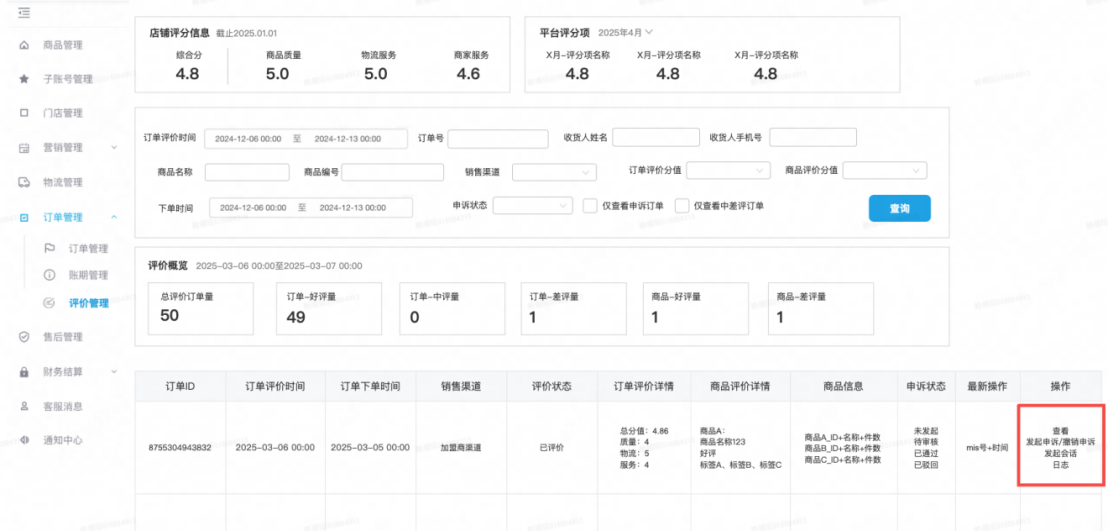 ①操作路径:订单管理-评价管理,可查看店铺评分明细;
