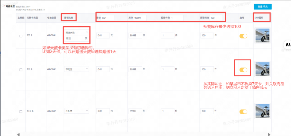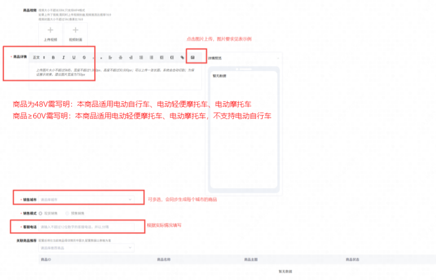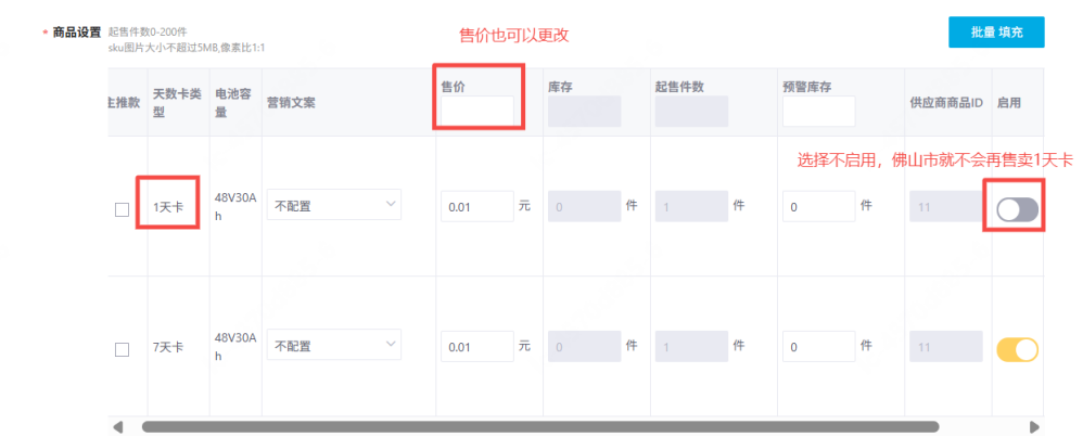 1)商品支持批量创建,创建平台商品绑定多城市自动生成多个分城关联商品,关联商品需要二次编辑,仔细确认价格及电池型号信息无误后再次提审并上架。