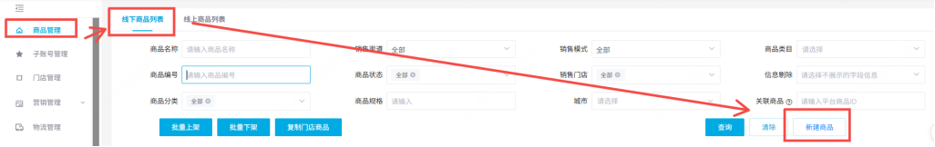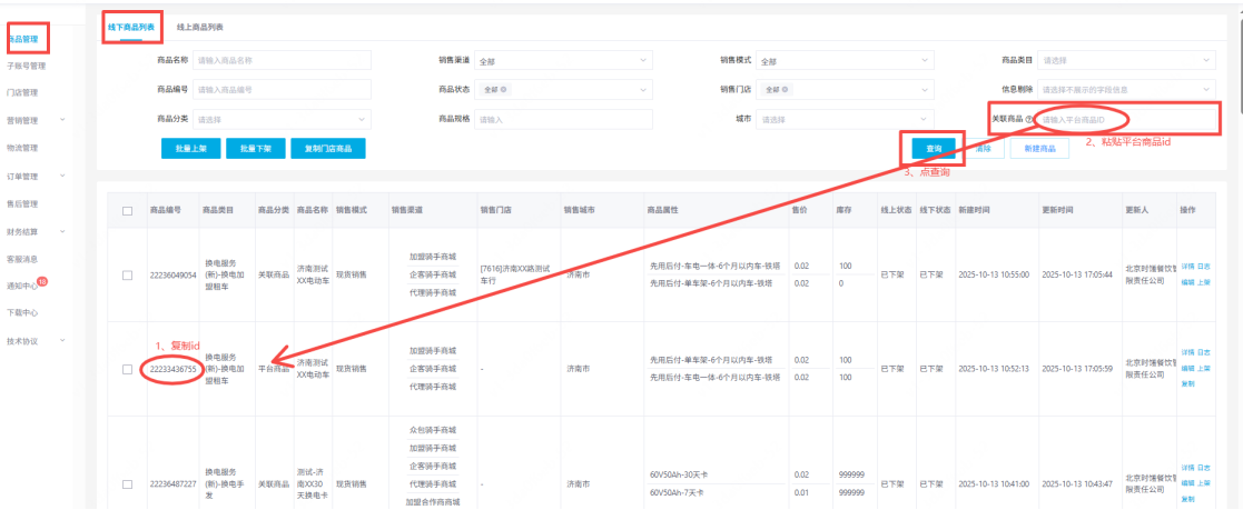 1)平台商品审核通过后,在线下商品列表里筛选‘商品类目’找到创建的平台商品,点击上架,耐心等待1分钟点查询,系统按城市维度自动生成关联商品;