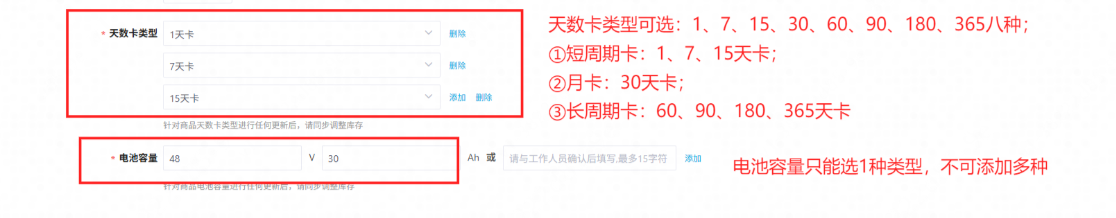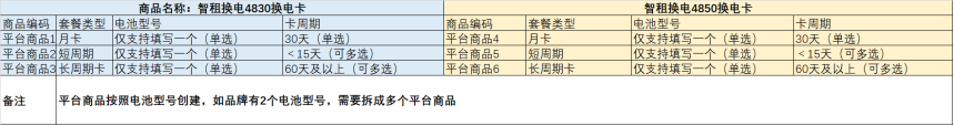 以电池容量为依据(每个商品只能填写一个电池型号),按照短周期卡、月卡、长周期卡分开创建平台商品,以智租商品为例