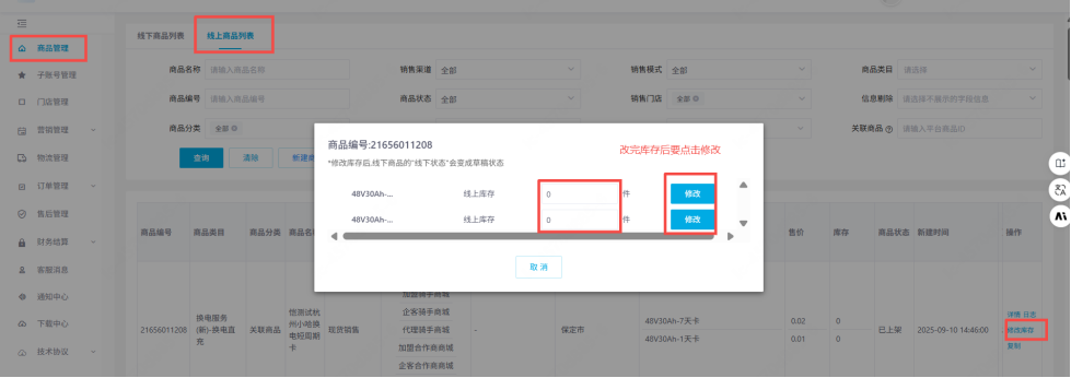 2)商品上架后,线上商品列表支持调整库存,且不用提交审核;