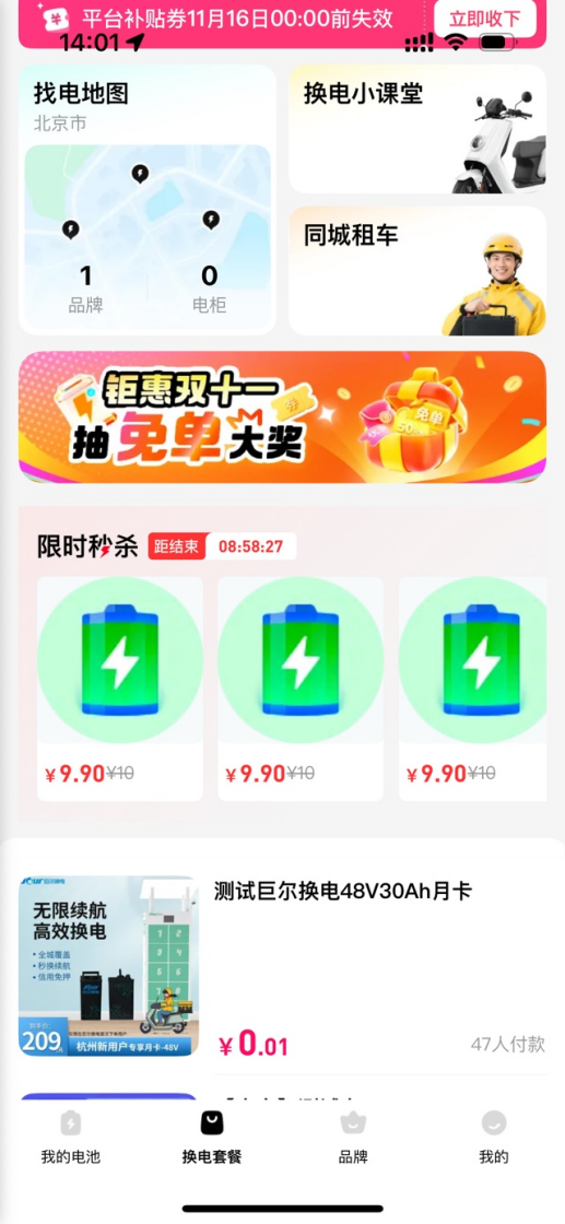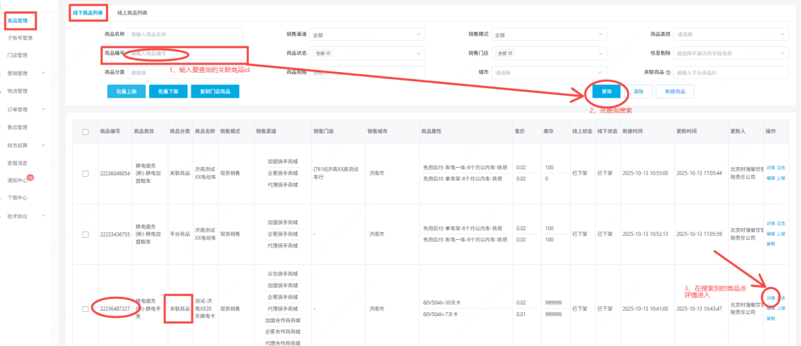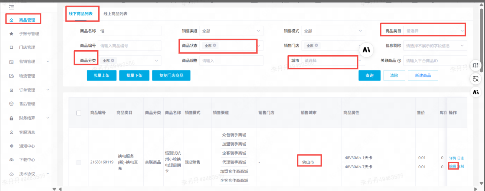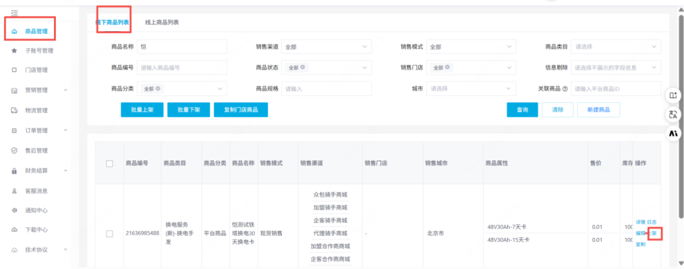 4)上架完毕后,提供关联商品的商品编码给美团运营,进行搭建,搭建后的商品才会在智能换电入口展示。