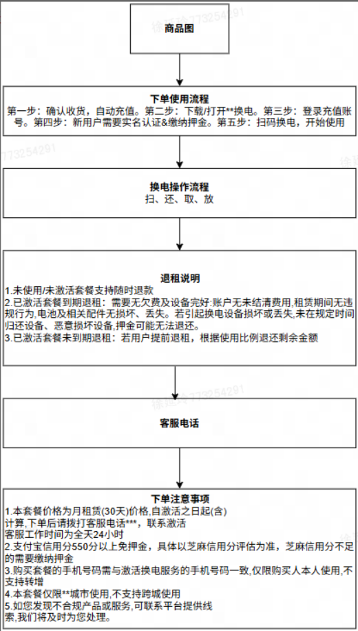 2.1.10 商品详情:商品图-下单使用流程-换电操作流程-退租说明-客服电话-下单注意事项-自定义