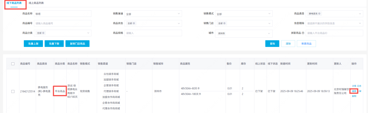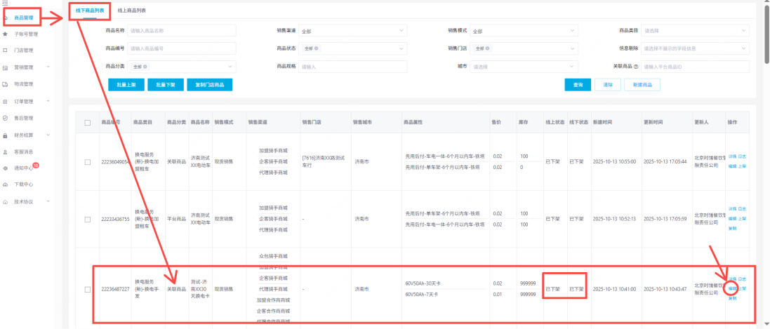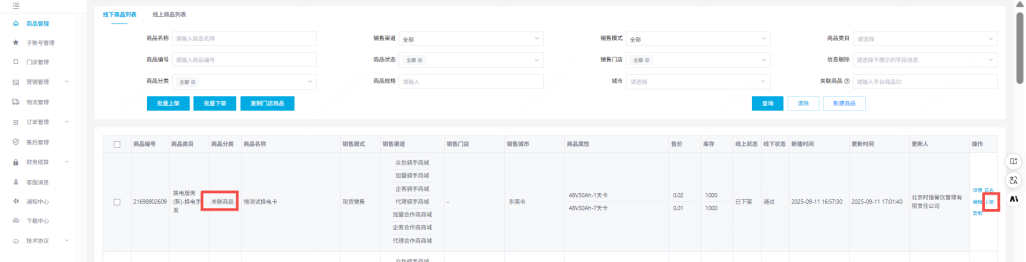 2)修改销售渠道及价格,商品管理-线下商品列表-筛选商品分类-找到关联商品-编辑-提审-上架,每次修改后需重新提交审核;审核通过后需要重新上架覆盖旧商品。