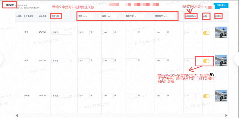 3)启用按钮说明:每个城市销售的卡周期可能不同,如佛山市不售卖1天卡,只售卖7天卡,可以单独更改佛山市的关联商品,在线下商品列表里找到佛山的关联商品,点击编辑,在商品设置里选择1天卡不启用(不启用状态下商品不对骑手销售和展示,注意,不启用的商品预警库存要改为0),点击提交审核,审核通过后重新点击上架。