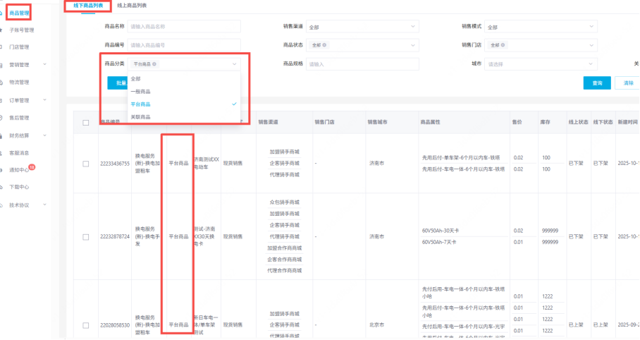 方法一:筛选商品分类是平台商品/关联商品,可看到所有相关商品