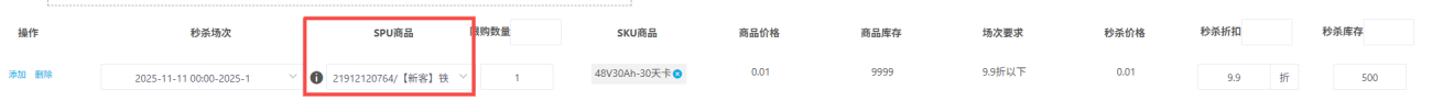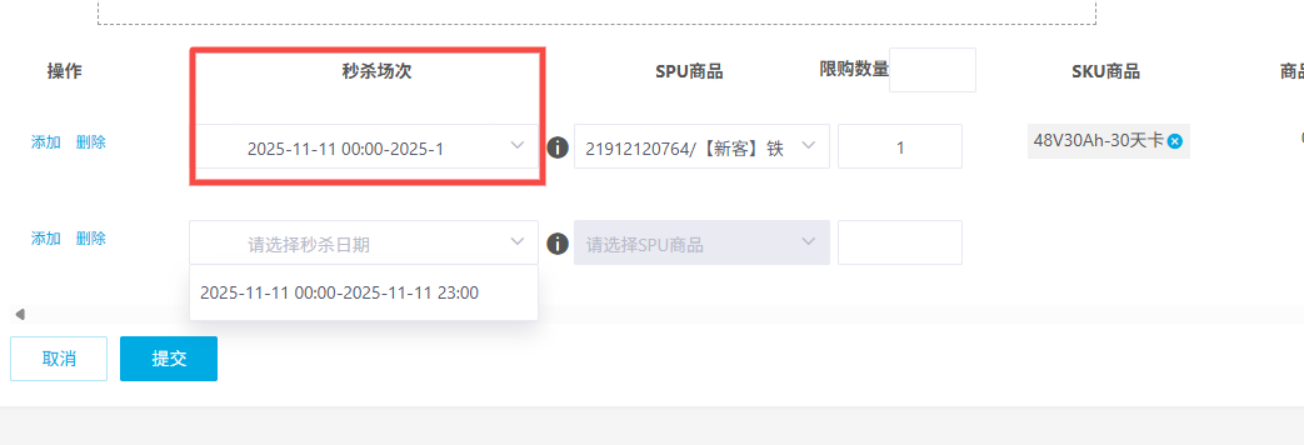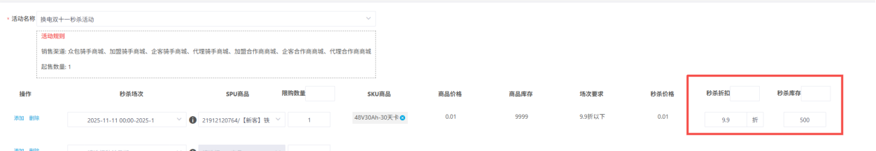 a.在报名秒杀页面,可以选择将要开始的活动,然后在下方选择“秒杀场次”,并设置不同场次需要参加的商品,并设置相关库存,价格,折扣等;(设置相关参数时,请关注“活动规则”,如不符合规则,则会导致提交失败)