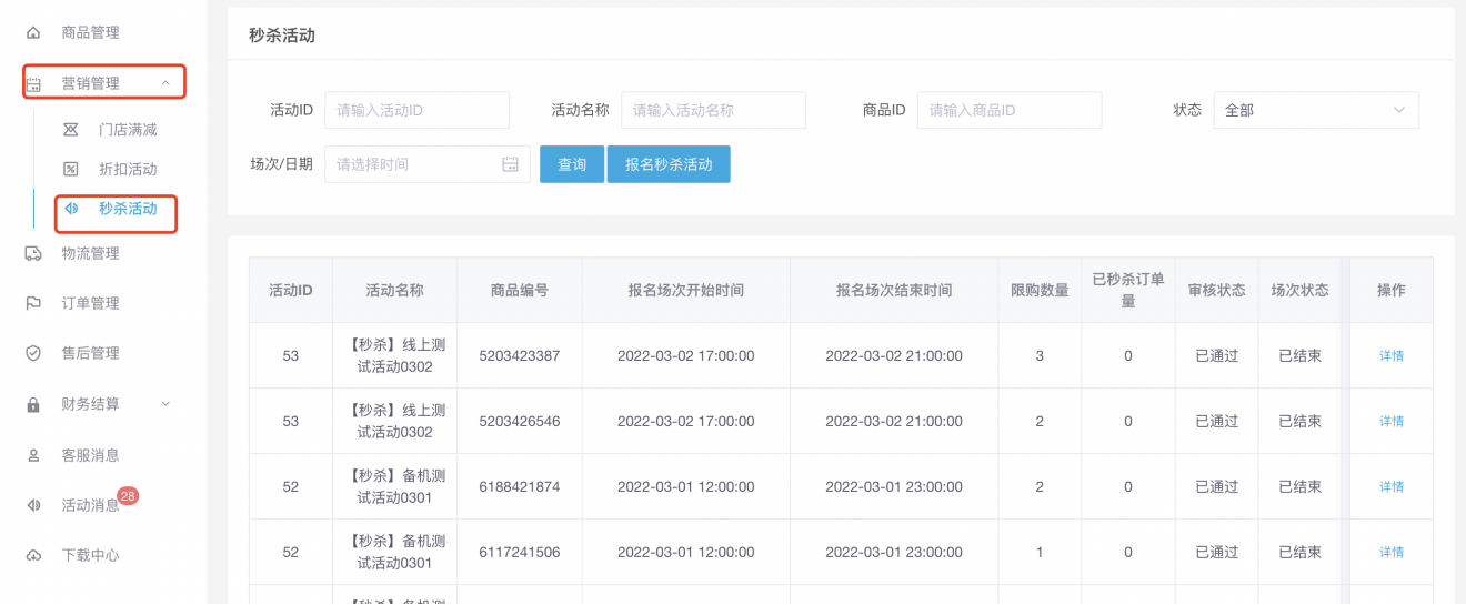 ①在营销活动中,选择秒杀活动,可跳转到秒杀活动列表页,支持按照“活动ID”,“活动名称”,“商品ID”,“状态”,“场次/日期”维度进行筛选;