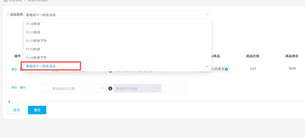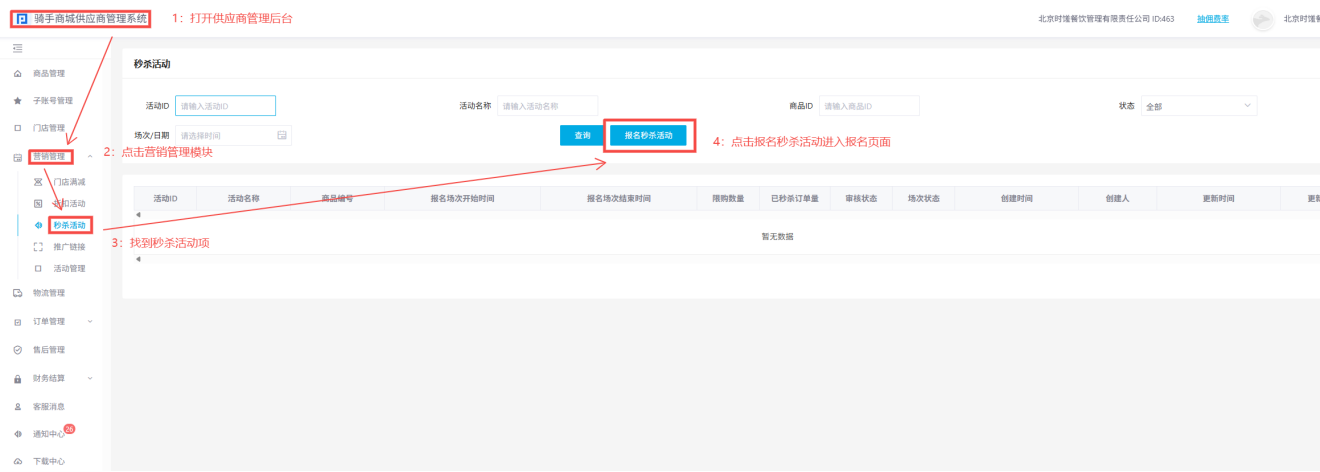 (1)报名秒杀活动:营销管理-秒杀活动-报名秒杀活动