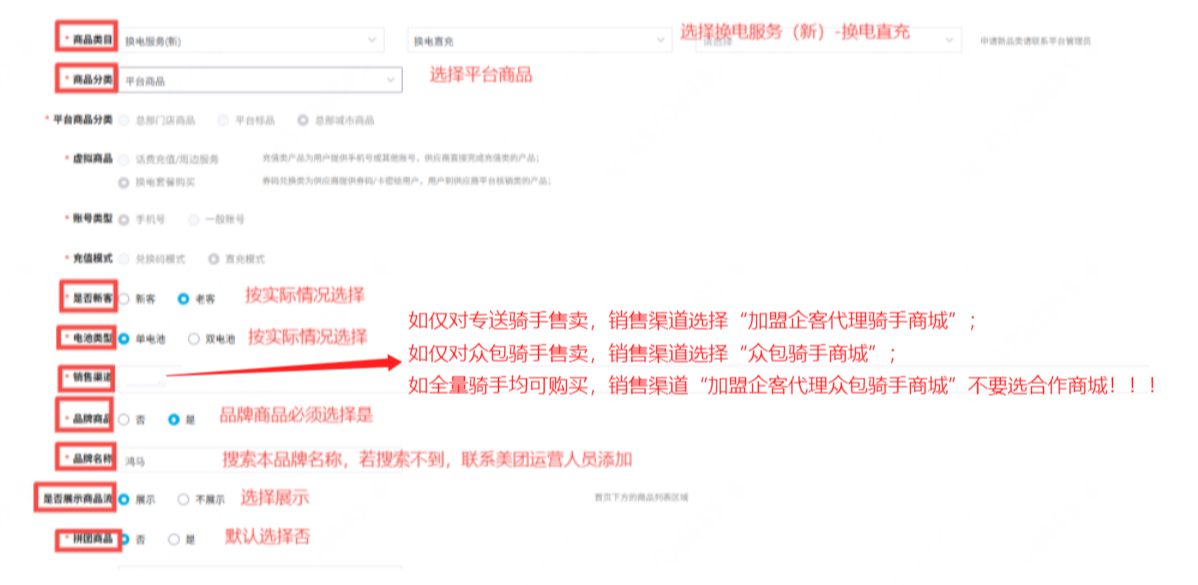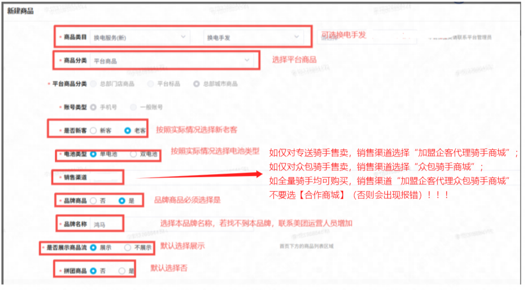如仅对专送骑手售卖,销售渠道选择“加盟、企客、代理骑手商城”;如仅对众包骑手售卖,销售渠道选择“众包骑手商城”,如全量骑手均可购买,销售渠道“加盟、企客、代理、众包骑手商城”不要选【合作商城】(否则会出现报错)!!!